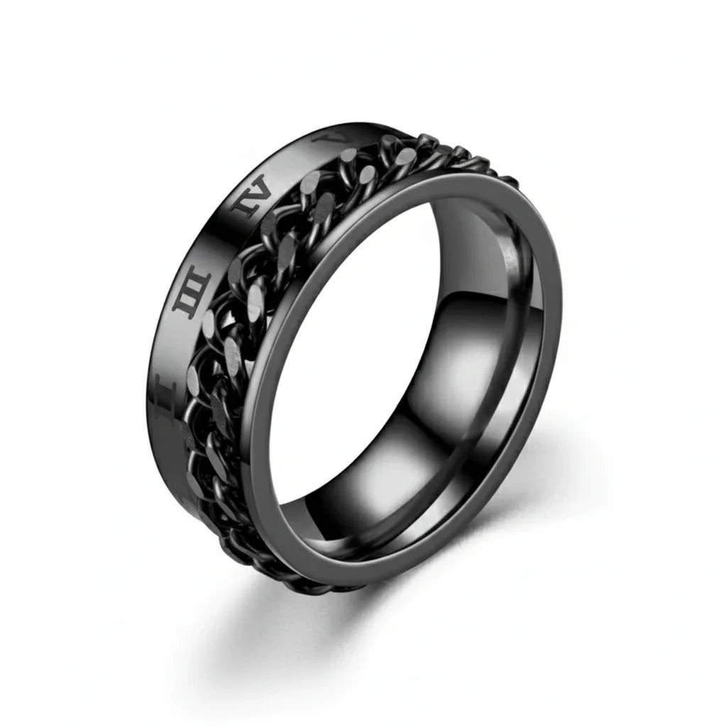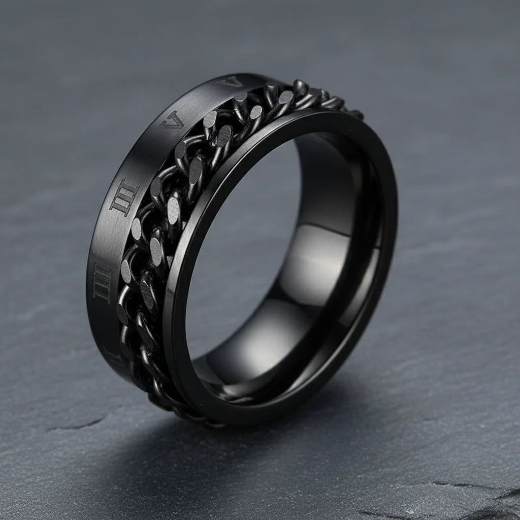 Oubliez les bijoux ennuyeux. Cette bague en acier noir et chiffres romains est votre touche rebelle.